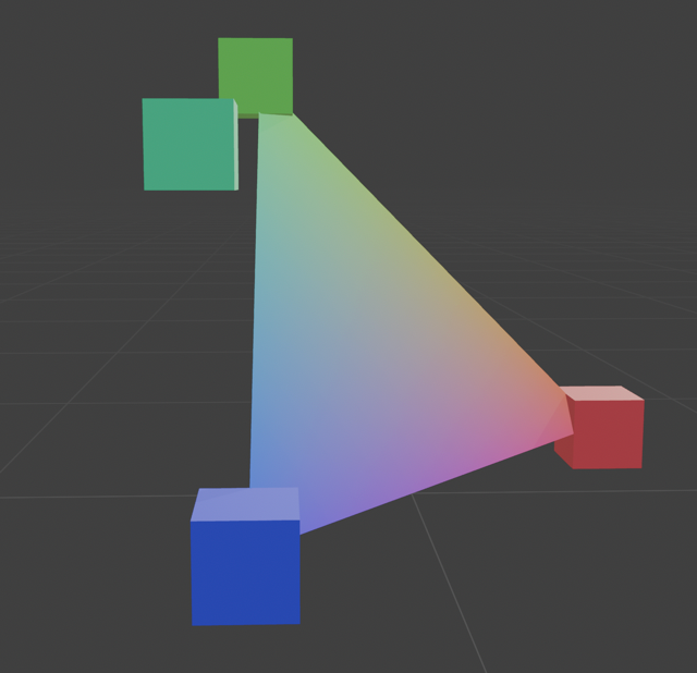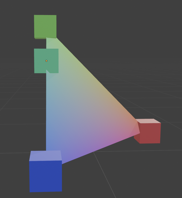 Now, let’s take an orthographic projection that orients our primaries as three points on a triangle. We can use Grassmann’s laws to interpolate between the primaries. (Grassmann’s laws require being in a linear space. An orthographic projection of a linear space remains linear, so Grassmann’s laws still apply.)
