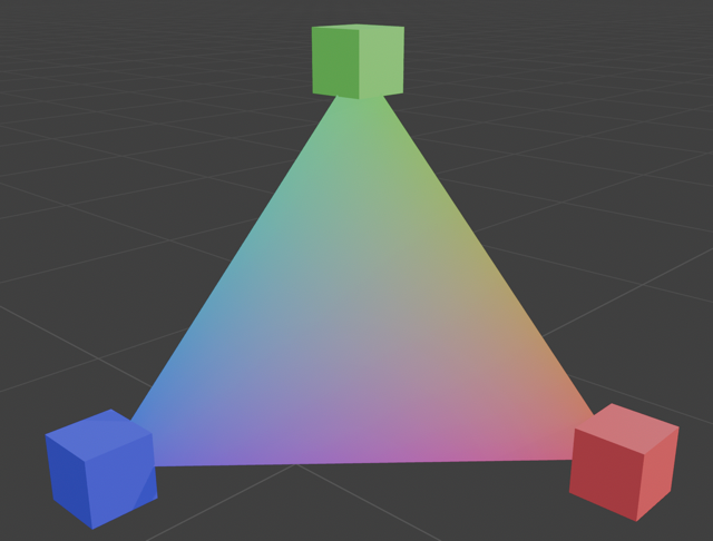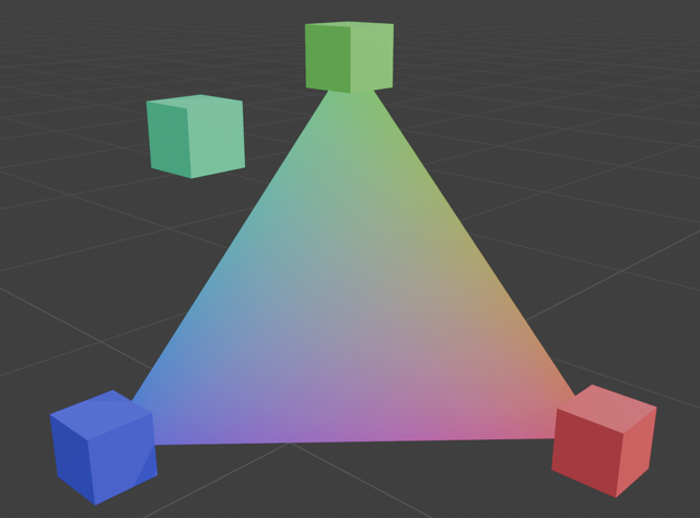 Now, let’s take an orthographic projection that orients our primaries as three points on a triangle. We can use Grassmann’s laws to interpolate between the primaries. (Grassmann’s laws require being in a linear space. An orthographic projection of a linear space remains linear, so Grassmann’s laws still apply.)